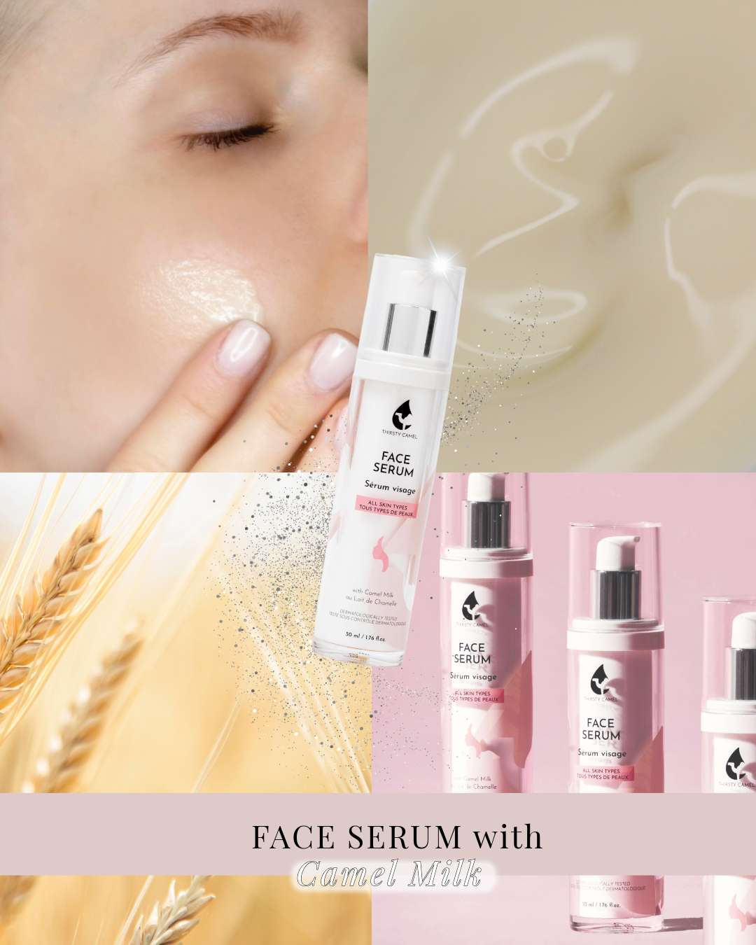 Camel milk has a distinctive milk structure and genetic makeup that contains naturally produced nutrient dense active ingredients and is filled with an abundance of rich, healthy and natural AHAs, vitamins and minerals. This unique structure is able to penetrate not only the surface of the skin but deep into the skins lower layers where a cocktail of naturally occurring active ingredients work together to nourish the skin naturally. This makes camel milk an active ingredient that is highly valued in the cosmetic industry as it not only nourishes the skin but also preserves the skin from daily aggressions and contributes to its suppleness and elasticity.